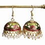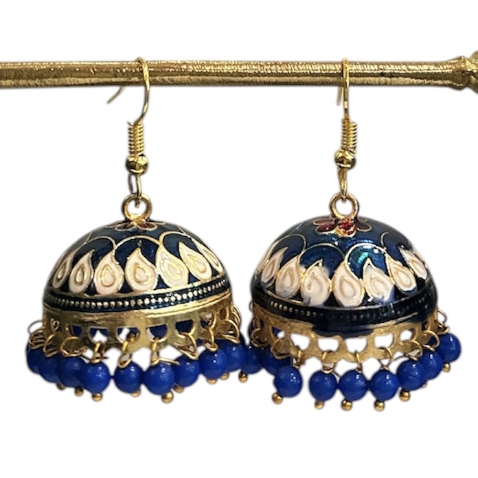Boucles d'oreille émaillées faites à la main, cloisonnées, en métal doré, style afghan . Dimensions : H2,5 x L1,5 cm (fermoir inclus) et diamètre 2,5 cm (pendant seul). On aime : leurs lignes finement ciselées, leurs couleurs pétillantes. Matière : laiton émaillé et perles. Fermoir crochet. Pièce artisanale. Les couleurs et motifs (hors perles) peuvent varier d'un modèle à l'autre.