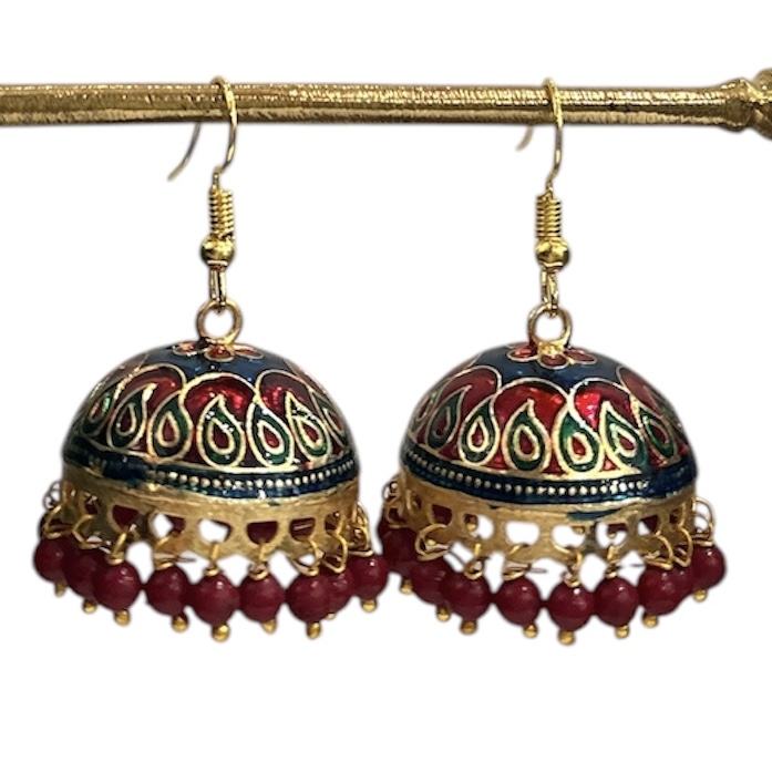 Boucles d'oreille émaillées faites à la main, cloisonnées, en métal doré, style afghan . Dimensions : H2,5 x L1,5 cm (fermoir inclus) et diamètre 2,5 cm (pendant seul). On aime : leurs lignes finement ciselées, leurs couleurs pétillantes. Matière : laiton émaillé et perles. Fermoir crochet. Pièce artisanale. Les couleurs et motifs (hors perles) peuvent varier d'un modèle à l'autre.