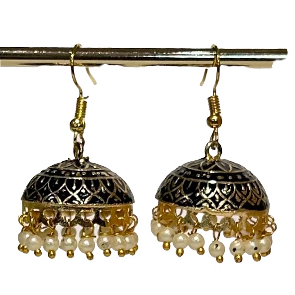 Boucles d'oreille en métal . On aime : leurs lignes finement ciselées et leurs petites perles qui tintent légèrement. Fermoir crochet. 2,5 cm de diamètre. Existe en plusieurs couleurs.