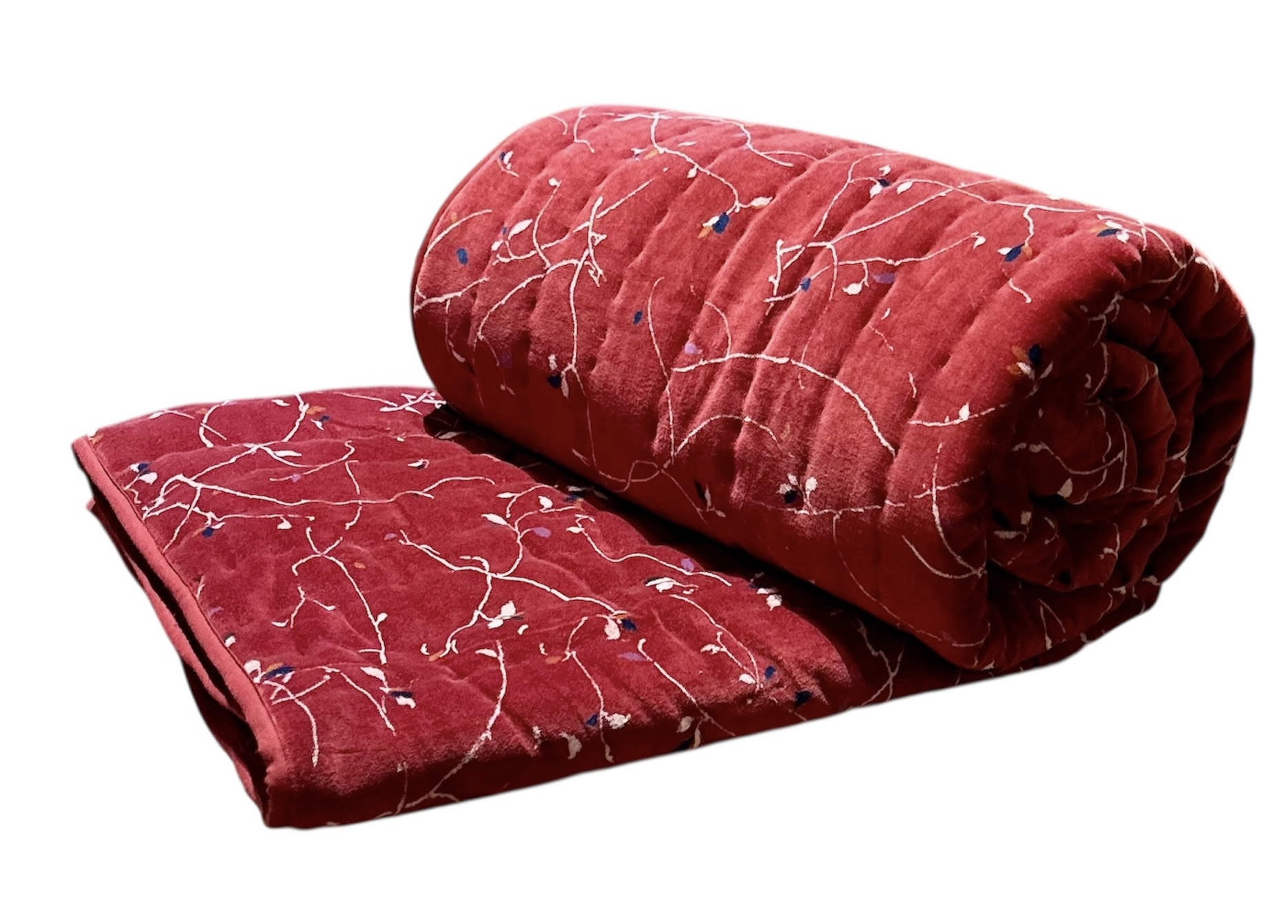 Dessus de lit molletonné et surpiqué à la main en velours de coton. Intérieur polyester. Courte pointe à poser sur votre lit . Le velours imprimé est lumineux donc il sera décoratif le jour et extrêmement douillet et confortable la nuit ! Face unie 100% coton. Motif Sensitive et Fils japonisant "Spring". Dimensions : 200 X 200 cm Existe en 3 coloris : rouge ,marine , parme