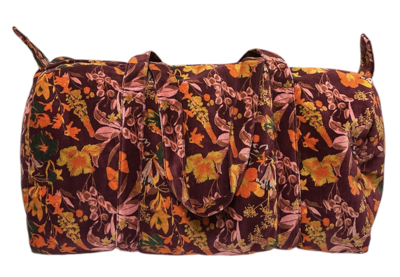 Sac en velours de coton , doublé en coton, forme "bowling" (cylindrique ). Ce sac multi fonctions vous accompagnera au sport, en week end , en courses. Lavable, beau, tout ce qu'on aime .